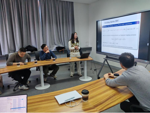 随后,天津大学谢满庭副教授和四川大学张少波博士分别为大家带来题为“A spectrally accurate numerical method for computing the Bogoliubov-de Gennes excitations of dipolar Bose-Einstein condensates”(偶极玻色-爱因斯坦凝聚体的BdG激发态的谱精确数值方法)和“Accurate and efficient numerical methods for computing dynamics and ground state of rotating dipolar Bose-Einstein condensates”(旋转偶极玻色-爱因斯坦凝聚体动力学和基态的高精度高效数值方法)的两场学术报告。他们各自从不同角度对BEC研究中的基态解、Bogoliubov激发态的高性能计算,分享了自己的研究成果。