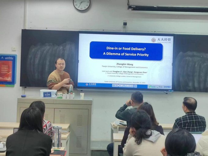 2023年12月12日,天津大学王钟彬副教授应邀来公司作了题为“Dine-in or Food Delivery? A Dilemma of Service Priority”的学术讲座,本次讲座由永利集团官网科学技术协会和yl88858永利官网共同主办。