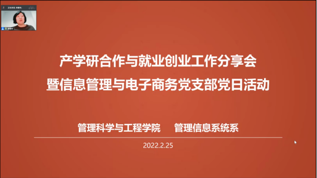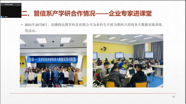 本次会议的主题为“促进产学研合作协同育人,推动就业创业工作提质增效”。会上首先由管理信息系统系主任、信息管理与电子商务党支部书记单春玲介绍了管信系近几年产学研合作情况。单主任从管信系现有校内外实习实训基地、产学研合作(企业专家进课堂)、产学研协同育人项目以及员工获奖情况等方面进行了详细介绍,并提出了未来展望,包括进一步推动产学融合,构建完善的创新创业课程教学体系和人才培养模式;提升员工综合能力与素养、鼓励创业、带动就业;发挥“研”的作用,促进科技成果转化。