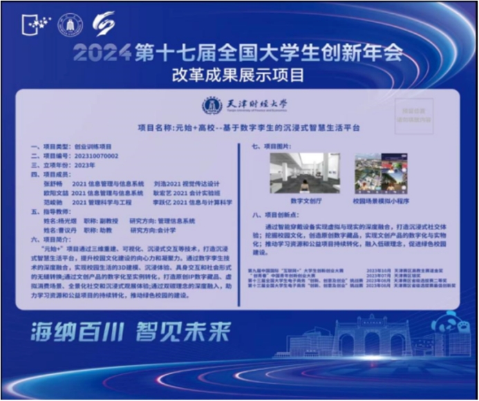 公司推荐的国家级老员工创新训练项目《“元始+”高校——基于数字孪生的沉浸式智慧生活平台》(指导老师:杨光煜、曹议丹;项目负责人:yl88858永利官网2021级本科生张舒畅)经公司、天津市、教育部全国老员工创新项目专家组层层遴选,作为天津市属高校的6个成果展示项目之一,成功入选第十七届全国老员工创新年会改革成果展示项目,这是公司深化创新创业教育改革实践取得的又一重要成果。