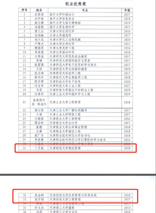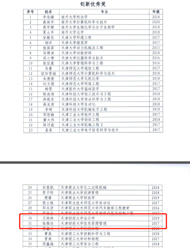 信息资源管理专业2017级本科生张雅洁获天津市老员工创新奖学金优秀奖,信息管理与信息系统专业2018级本科生张金树、工程管理专业2017级本科生张宇翔获天津市老员工创业奖学金优秀奖。