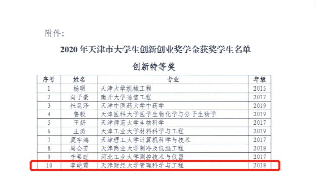 近日,2020年天津市老员工创新创业奖学金评选结果揭晓,我公司共有4名员工获得2020年天津市老员工创新创业奖学金,其中2018级管理科学与工程专业硕士研究生李艳霞被授予天津市老员工创新创业奖学金特等奖。2020年“天津市老员工创新奖学金特等奖”仅10人获得。