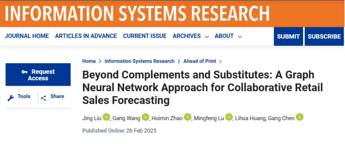 近日,公司刘婧副教授在国际顶级期刊Information Systems Research(UTD 24)上以第一作者身份在线发表学术论文“Beyond Complements and Substitutes: A Graph Neural Network Approach for Collaborative Retail Sales Forecasting”。